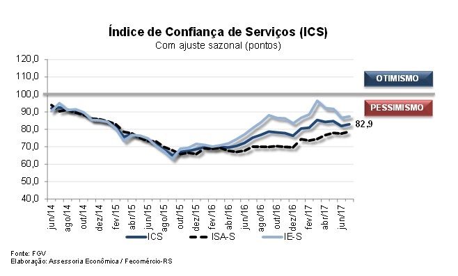 O Índice de Confiança de Serviços (ICS), da FGV, registrou aumento de 1,2% entre junho e julho, passando dos 81,9 pontos para os 82,9 pontos, na série com ajuste sazonal. Em relação ao mês de julho de 2016, o indicador registrou alta de 10,2%. Na comparação mensal, o resultado do ICS foi motivado tanto pela melhora na avaliação da situação corrente quanto pelo aumento das perspectivas em relação ao futuro. O Índice de Situação Atual (ISA-S) cresceu 1,4% (de 77,5 pontos para
